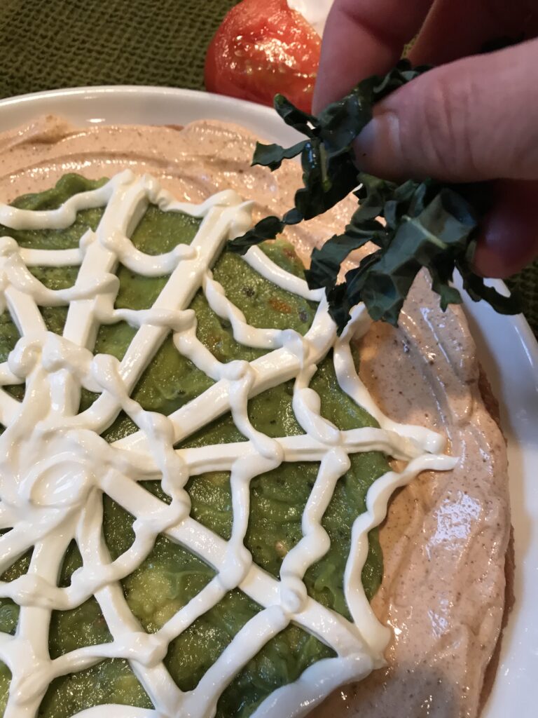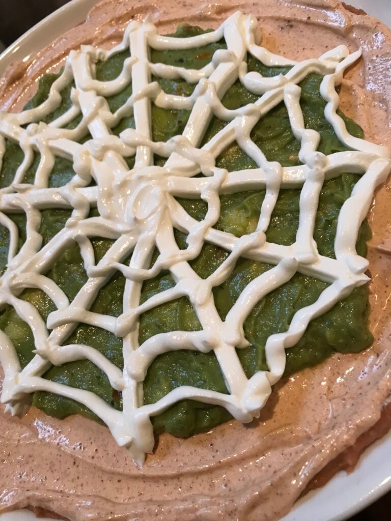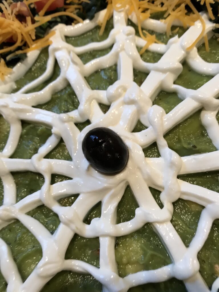 Next, take your 1/2 C of sour cream and put it into a ziploc bag all into one corner. Cut a very small piece off the corner and use the bag to draw the spider web on top of the guacamole.