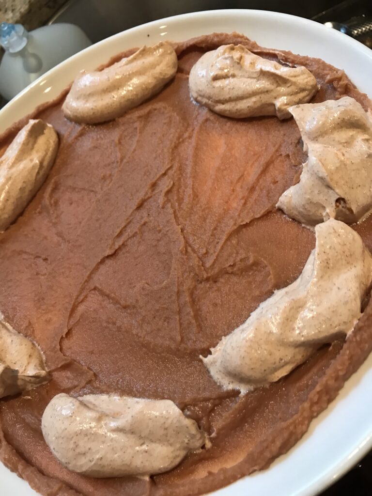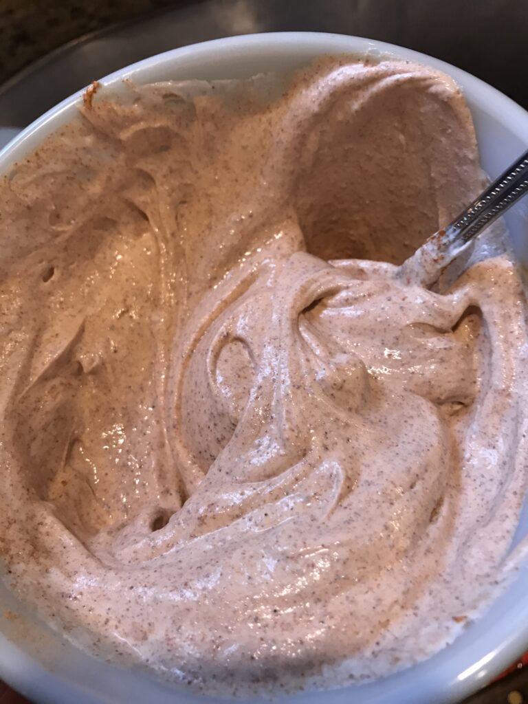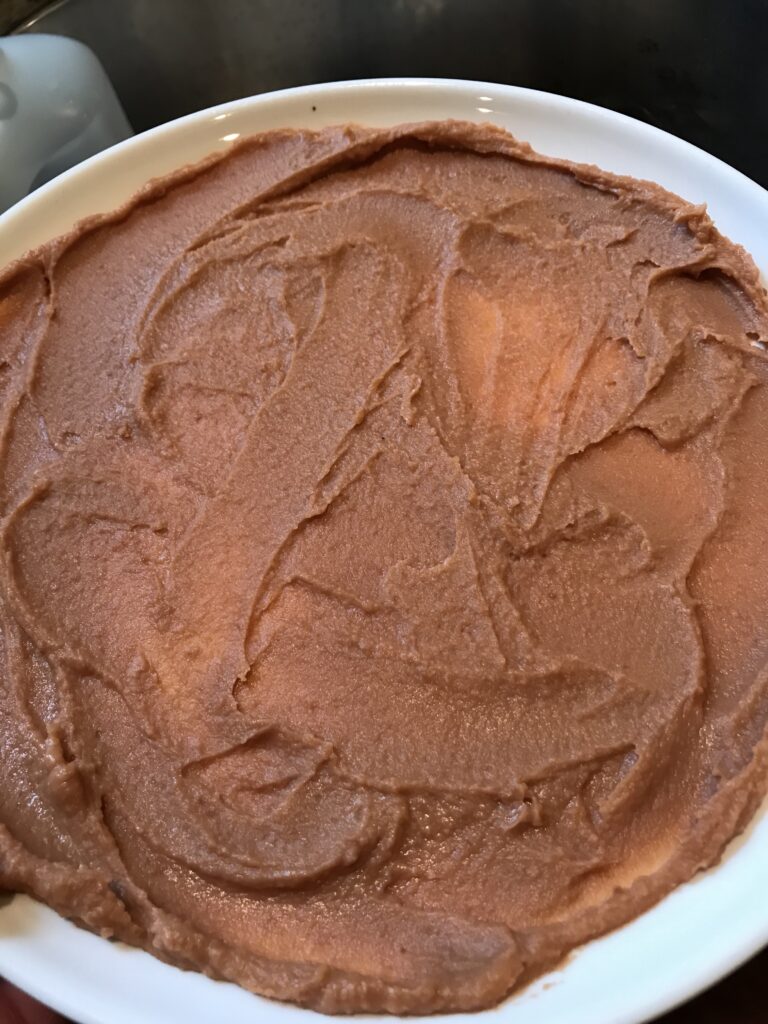 I used an 8″ plate for this recipe, begin by spreading the bean dip across the whole plate.