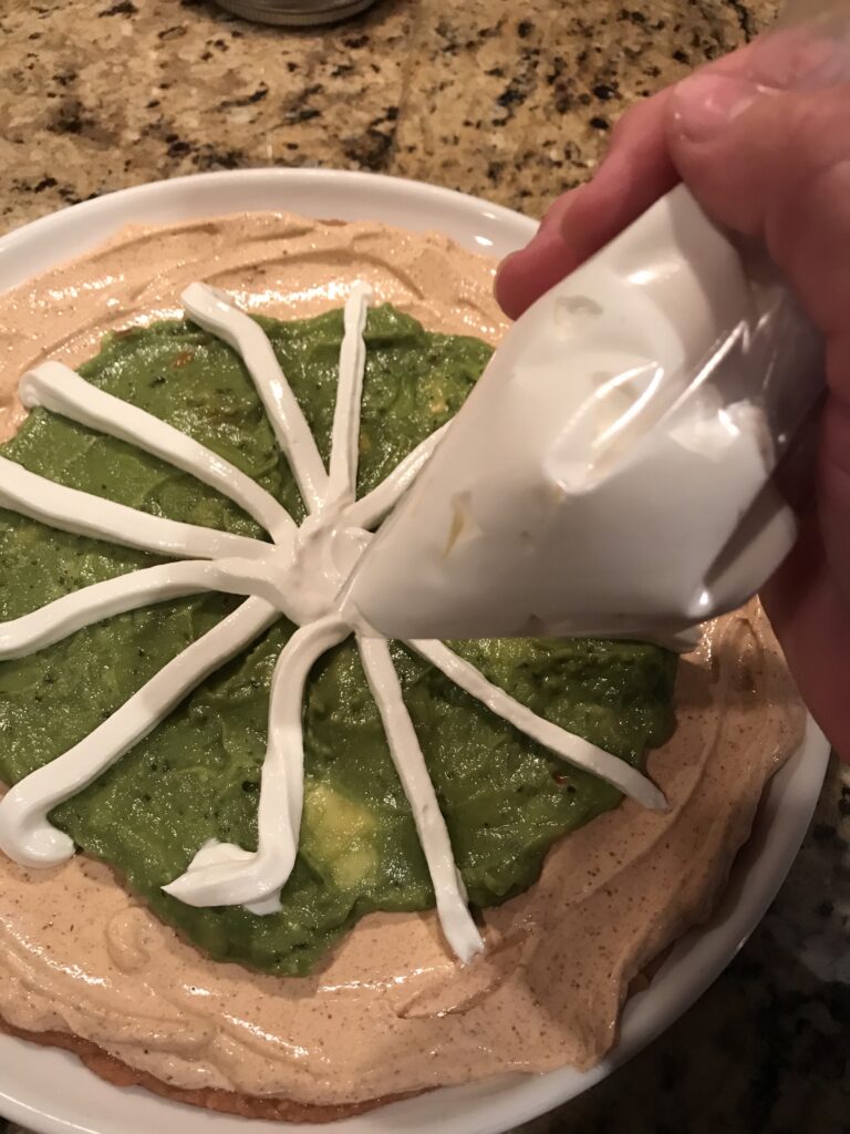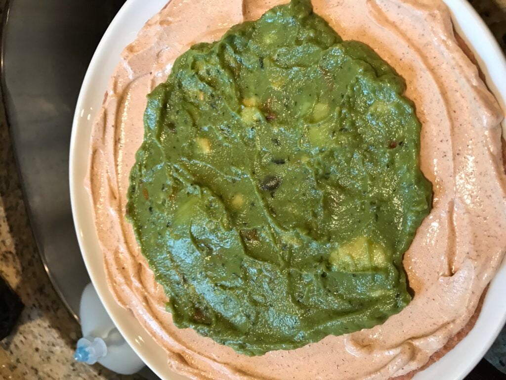 On top of the beans and just in the center of the sour cream ring, spread the guacamole.